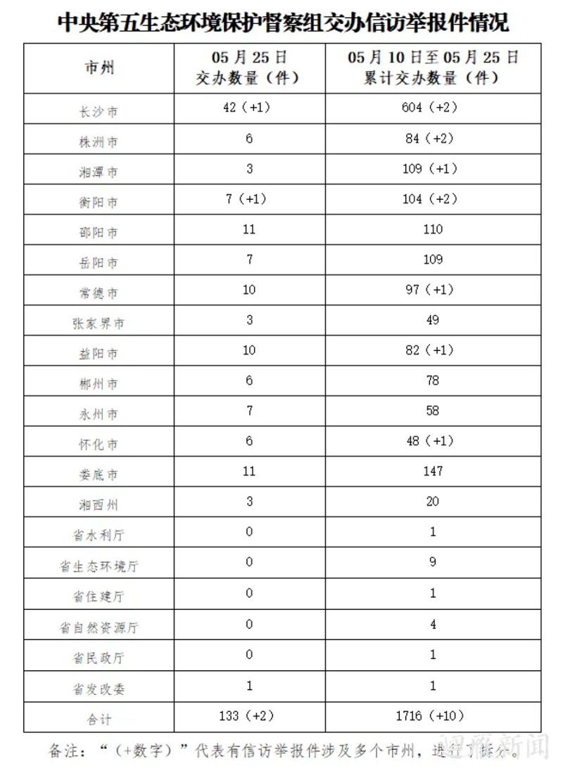 中央第五生态环境保护督察组今天向湖南交办群众信访举报件133件(来电举报82件,来信举报51件),其中重点件15件。我省分解后交办135件,其中重点件15件。