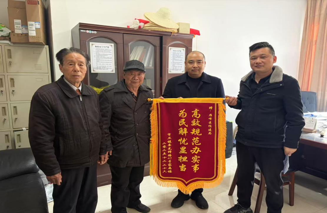 冬日暖阳照初心,锦旗无声谢真情。12月29日,雁峰区住建局办公室内暖意融融、笑语盈盈,先锋路42号楼栋的居民代表们怀着满心感激,将一面印着“高效规范办实事,为民解忧显担当”的鲜红锦旗郑重送到工作人员手中。锦旗上的鎏金大字熠熠生辉,既承载着居民们对旧楼加装电梯心愿得偿的喜悦,更凝聚着对区住建局倾心为民、实干担当的深切赞誉。
