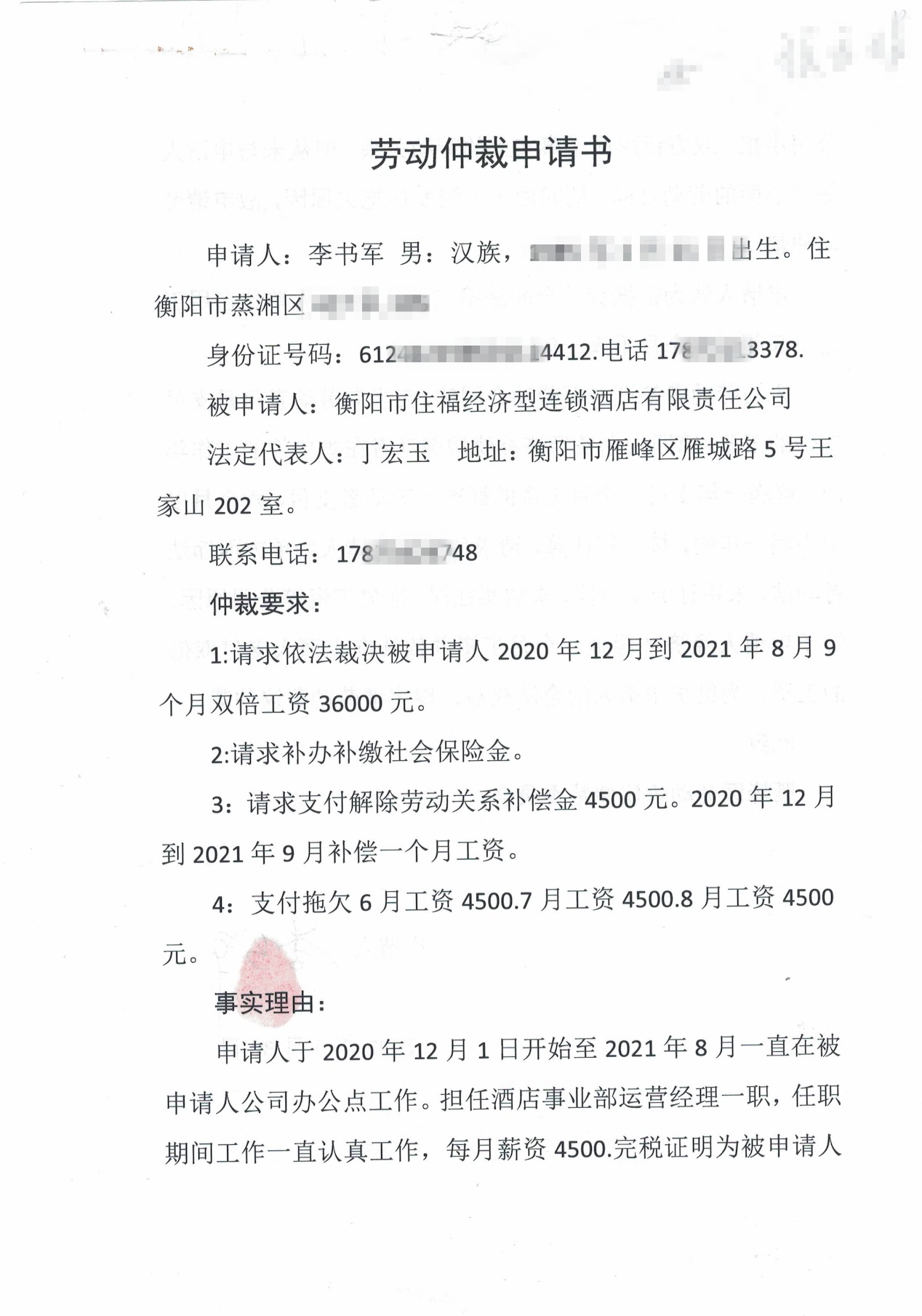 被申请人:衡阳市住福经济型连锁酒店有限责任公司(法定代表人:丁宏玉)