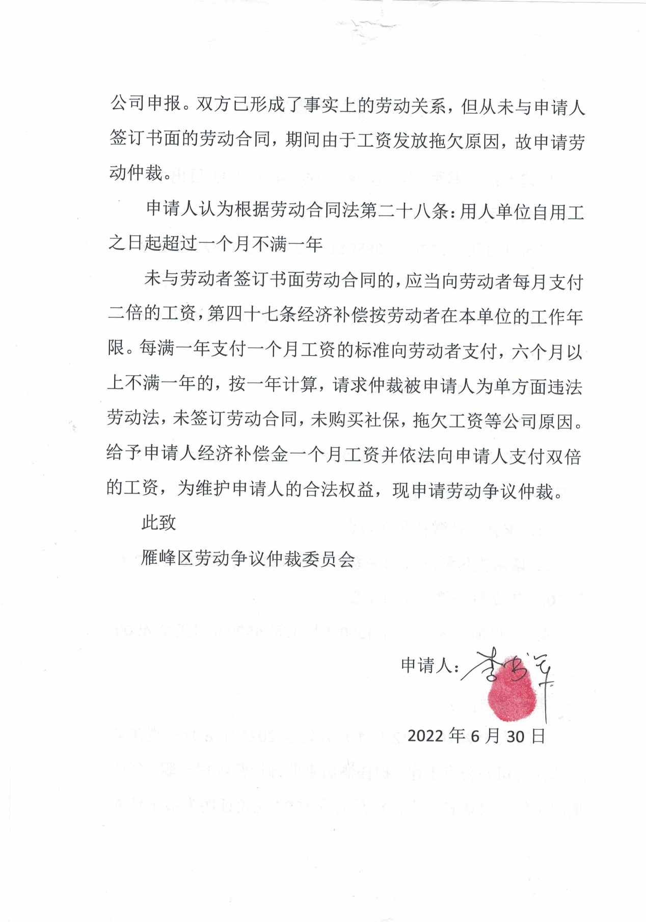雁峰区劳动人事争议仲裁委员会关于申请人