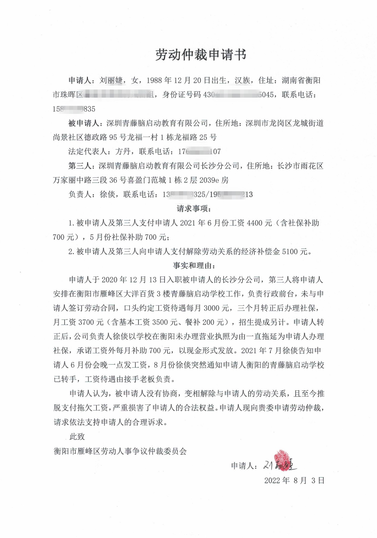 本委已受理申请人刘丽婕、颜琳之诉你单位劳动争议一案(雁劳人仲案字〔2022〕第92号、第93号),因无法与你单位取得联系,现依法向你单位公告送达申请书副本、应诉通知书及开庭通知书等,自公告发布之日起经过30日即视为送达。提交答辩书的期限为公告送达期满后的15日内。本委定于2022年10月18日上午9时00分开庭审理此案(到庭地址:湖南省衡阳市雁峰区蒸湘南路133号雁峰区政府7楼北729室,联系电话:0734-8799173),请准时参加庭审,否则本委将依法缺席审理。