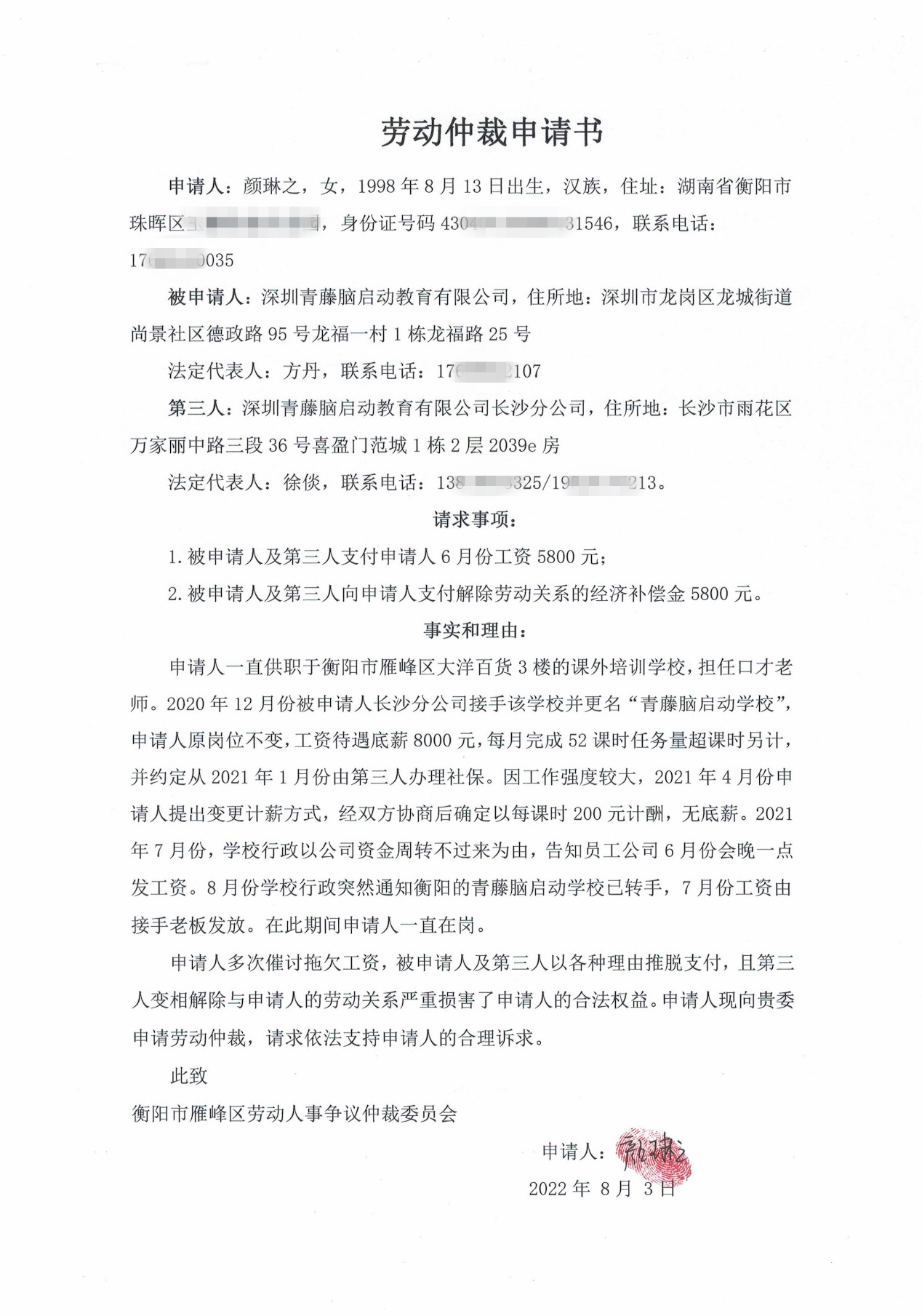 被申请人:深圳青藤脑启动教育有限公司(法定代表人:方丹)