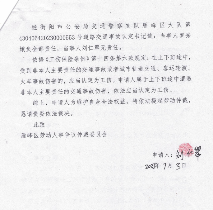 本委已受理申请人刘仁翠诉你单位劳动争议一案(雁劳人仲案字〔2023〕第169号),因无法与你单位取得联系,现依法向你单位公告送达申请书副本、应诉通知书及开庭通知书等,自公告发布之日起经过30日即视为送达。提交答辩书的期限为公告送达期满后的15日内。本委定于2023年10月10日下午3时30分开庭审理此案(到庭地址:湖南省衡阳市雁峰区蒸湘南路133号雁峰区政府7楼北729室,联系电话:0734-8799173),请准时参加庭审,否则本委将依法缺席审理。