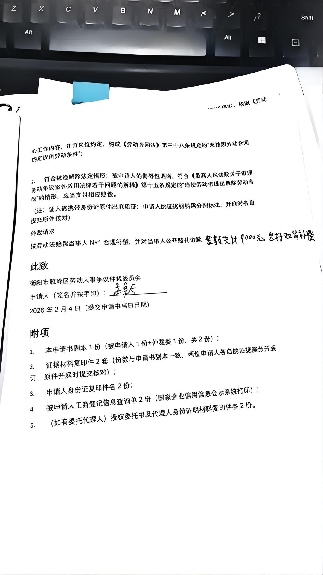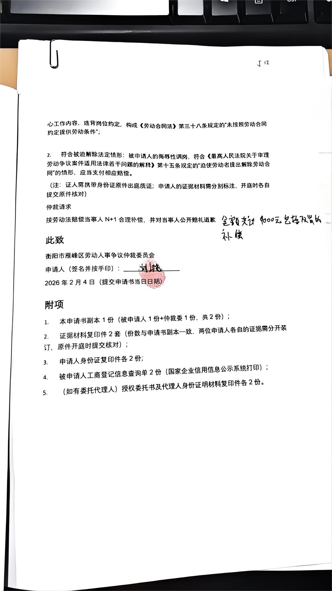 本委已受理申请人刘诗尧、孟昊天诉你单位劳动争议一案(雁劳人仲案字〔2026〕44、45号),2026年2月11日,本委通过邮政EMS邮寄仲裁申请书副本、应诉及开庭相关文书被退回。因无法与你单位取得联系,现依法向你单位公告送达申请书副本、应诉通知书及开庭通知书等,自公告发布之日起经过30日即视为送达。提交答辩书的期限为公告送达期满后的15日内。本委定于2026年5月12日上午9时00分开庭审理此案(到庭地址:湖南省衡阳市雁峰区蒸湘南路133号雁峰区政府7楼北729室,联系电话:0734-8799173),请准时参加庭审,否则本委将依法缺席审理。