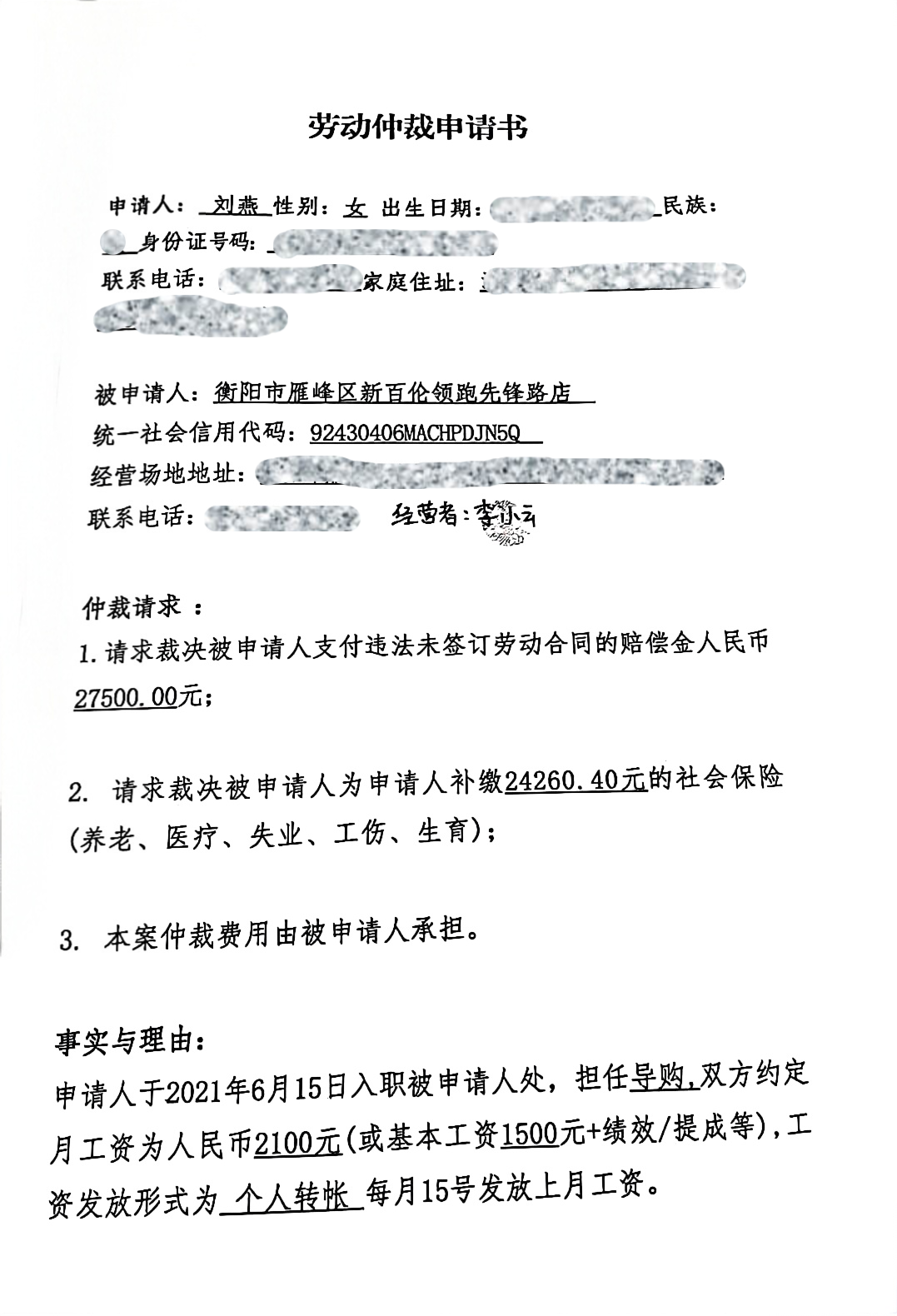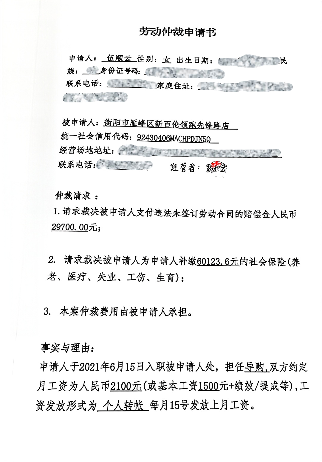 被申请人:衡阳市雁峰区新百伦领跑先锋路店(法定代表人:李小云)