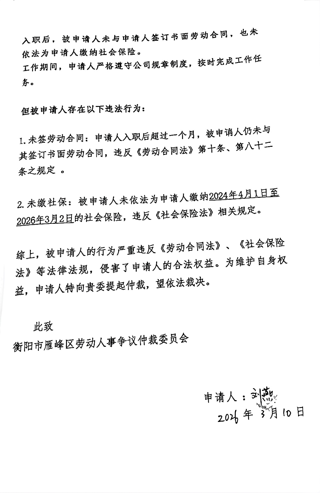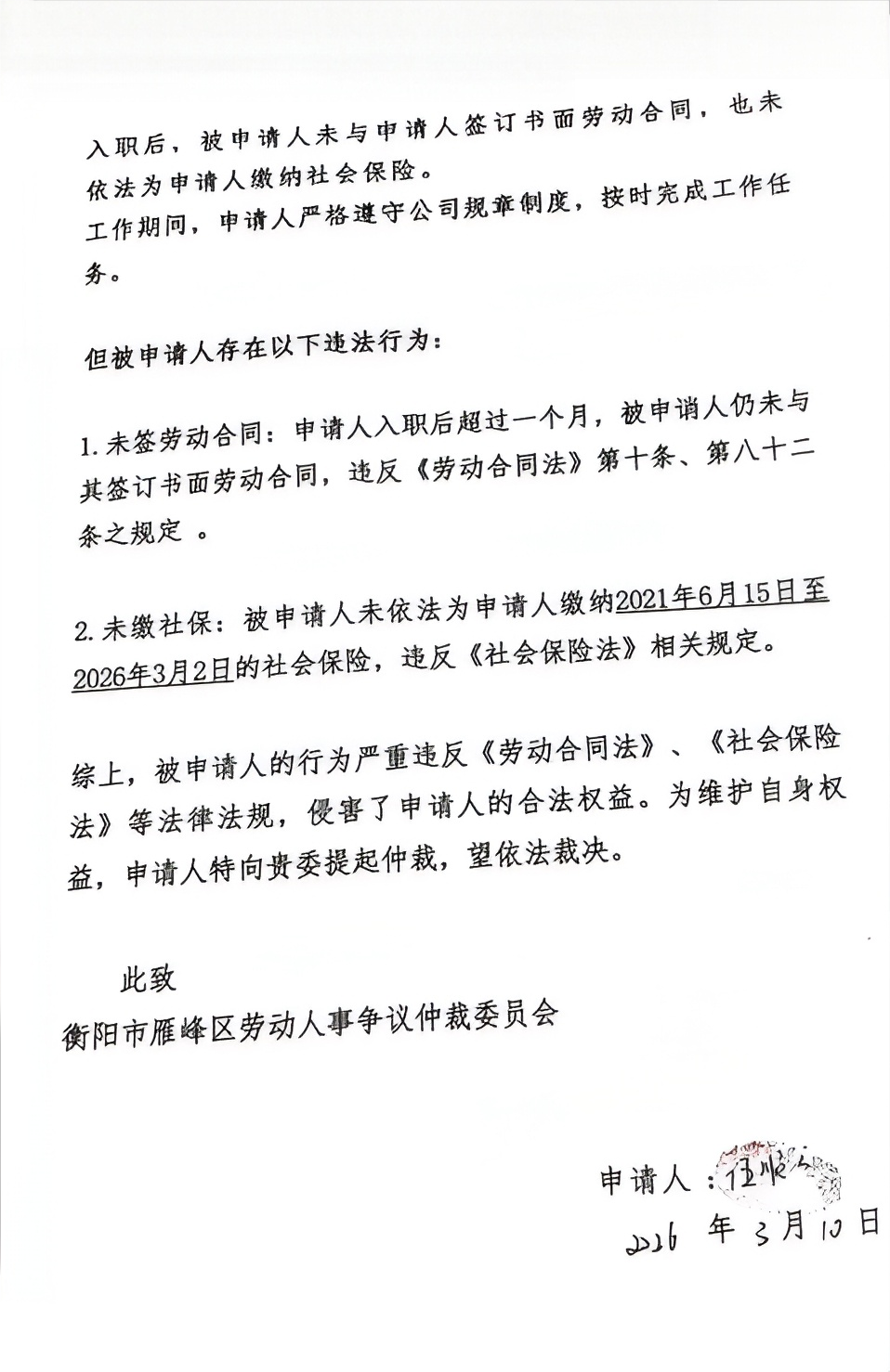 本委已受理申请人刘燕、伍顺云诉你单位劳动争议一案(雁劳人仲案字〔2026〕54、55号),2026年3月16日,本委通过邮政EMS邮寄仲裁申请书副本、应诉及开庭相关文书被退回。因无法与你单位取得联系,现依法向你单位公告送达申请书副本、应诉通知书及开庭通知书等,自公告发布之日起经过30日即视为送达。提交答辩书的期限为公告送达期满后的15日内。本委定于2026年5月21日上午9时00分开庭审理此案(到庭地址:湖南省衡阳市雁峰区蒸湘南路133号雁峰区政府7楼北729室,联系电话:0734-8799173),请准时参加庭审,否则本委将依法缺席审理。