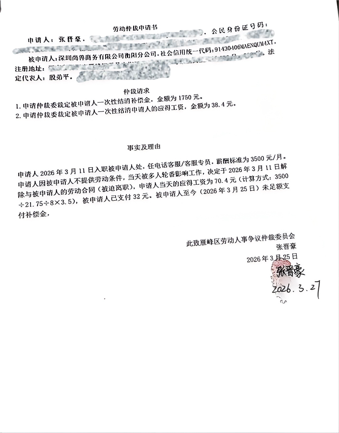 本委已受理申请人张晋豪诉你单位劳动争议一案(雁劳人仲案字〔2026〕63号),2026年3月31日,本委通过邮政EMS邮寄仲裁申请书副本、应诉及开庭相关文书被退回。因无法与你单位取得联系,现依法向你单位公告送达申请书副本、应诉通知书及开庭通知书等,自公告发布之日起经过30日即视为送达。提交答辩书的期限为公告送达期满后的15日内。本委定于2026年5月19日下午14时30分开庭审理此案(到庭地址:湖南省衡阳市雁峰区蒸湘南路133号雁峰区政府7楼北729室,联系电话:0734-8799173),请准时参加庭审,否则本委将依法缺席审理。