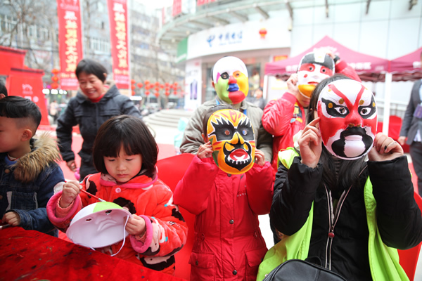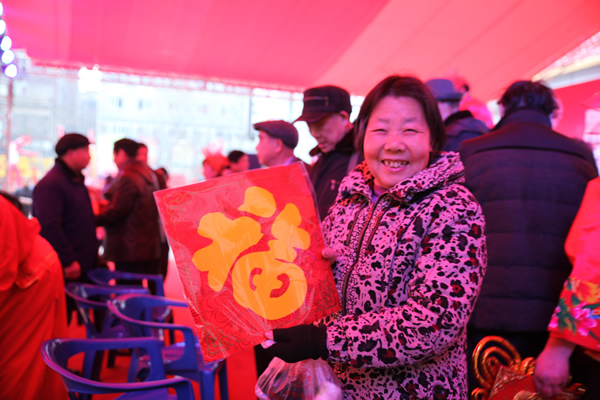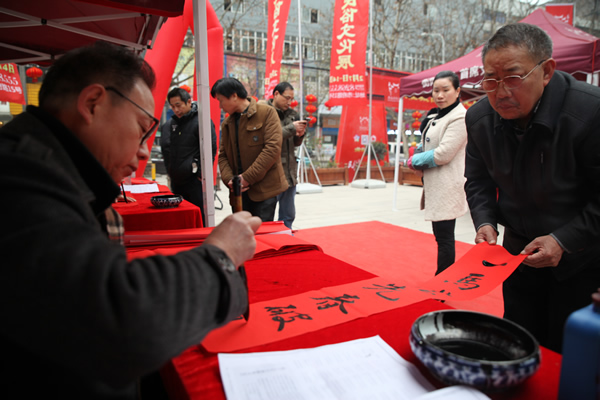 台上欢歌热舞,台下才情并茂。在广场的另一端,诸如糖画、手绘脸谱等既具有民俗风情,又颇有独家技艺的展台吸引了不少市民。小朋友们围着展示台,兴致勃勃地学着能工巧匠的活,并欣然动手尝试制作。主办方邀请了辖区书法名家现场写春联,市民们围成圈子观看,有秩序地领取一副副春联,不少观众现场领得“福”字,笑容满面地离去。
