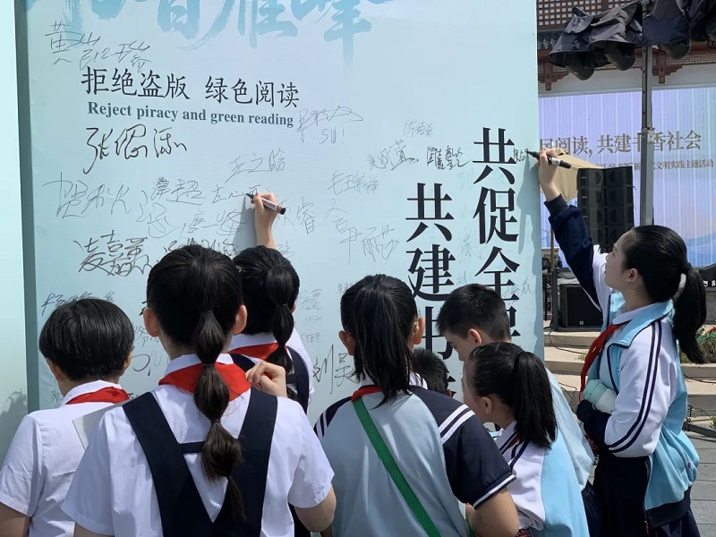 启动仪式现场,童声合唱《书香中国》、古典舞蹈《知音锁》、经典诵读《呼兰河传》《书香少年》等节目轮番上演,孩子们清亮的歌声、演员们优美的舞姿,将阅读之美与文化之韵完美融合,赢得现场观众阵阵掌声。学生志愿者宣读“护苗・绿书签”倡议书,发出“拒绝盗版、绿色阅读”的倡议,现场中小学生代表纷纷在承诺墙上签名,用行动守护清朗阅读空间。