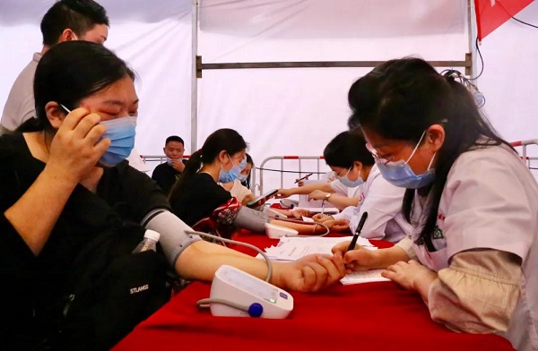 ▲疫苗接种前,市民排队进行体温检测 肖友良摄