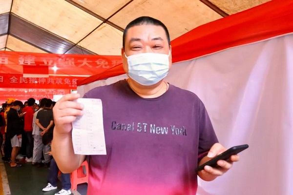 ▲接种三十分钟后,市民领到接种证明单 程聪摄
