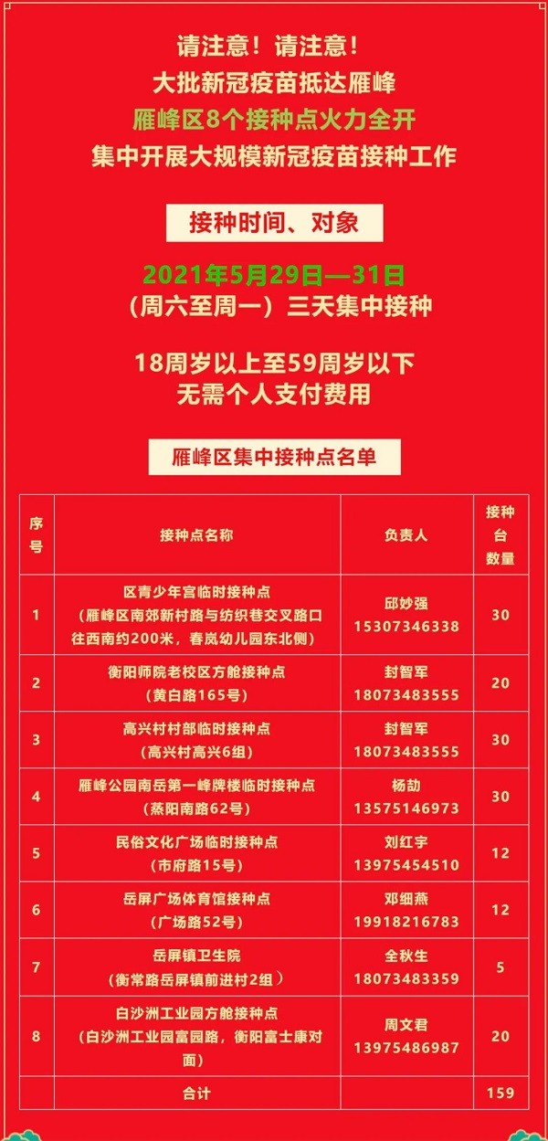 5月29日,衡阳市雁峰区正式启动大规模人群新冠疫苗接种工作,辖区设7个方仓点、1个固定点及一台流动车,共163个固定接种台为市民提供安全、优质的疫苗接种服务。5月29日至31日,全区计划完成10万人次接种工作。
