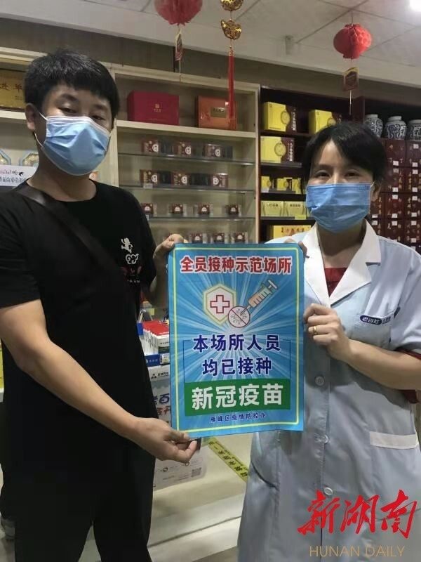 8月7日,衡阳市雁峰区市场监督管理局为辖区内从业人员新冠疫苗接种率为100%的餐饮店、药店等50家经营主体评定颁发“全员接种示范场所”标志。据悉,这是雁峰区在衡阳市率先评定颁发“全员接种示范场所”标志。