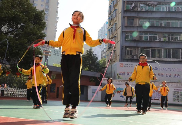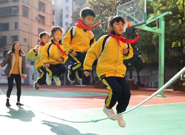 2021年11月10日,湖南省衡阳市雁峰区环城南路小学,同学们在跳绳。