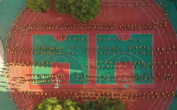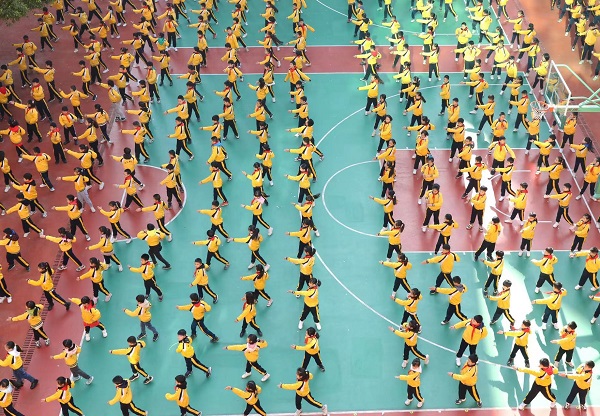 2021年11月10日,湖南省衡阳市雁峰区环城南路小学,同学们在跑操(无人机照片)。 近年来,湖南省衡阳市雁峰区环城南路小学不断创新大课间活动内容,将传统文化、趣味游戏与体育运动相互融合,把“双减”政策落地落实,让学生在丰富多彩的文体活动中锻炼身体,快乐成长。