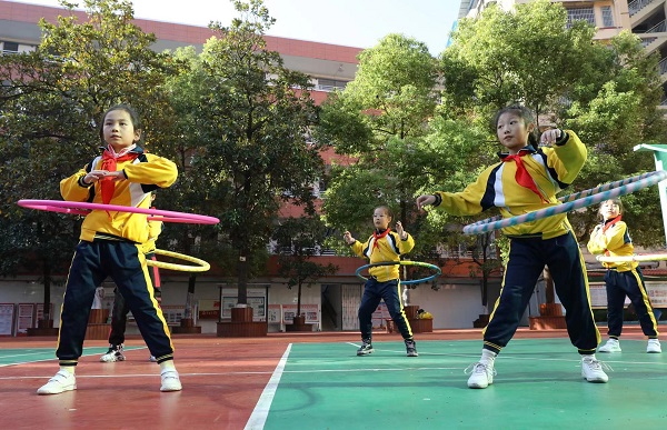 2021年11月10日,湖南省衡阳市雁峰区环城南路小学,同学们在摇呼啦圈。