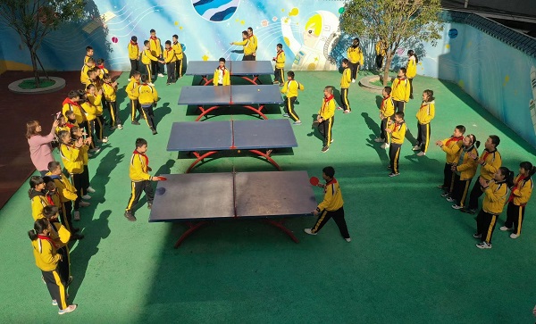 2021年11月10日,湖南省衡阳市雁峰区环城南路小学,同学们在打乒乓球(无人机照片)。