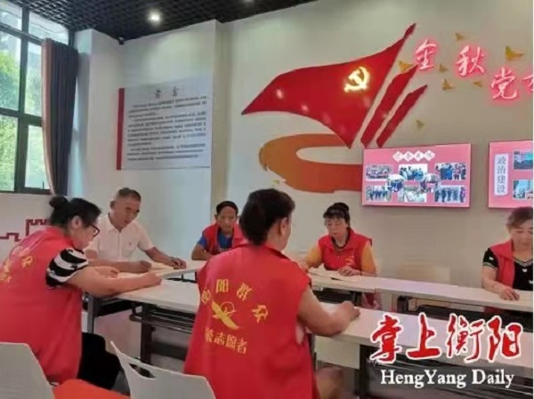 ▲幸福社区志愿者服务队在商量工作